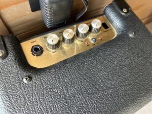 Mrshallの小さい方は”MG2FX”。2Wの小型アンプで一通りのエフェクト内臓の優れもの。アパートに住んでる時に使っていました。パイピングとロゴをGOLDに、グリルネットをラージチェックに張り替え70年代っぽいゴキゲンなルックスになっています♪