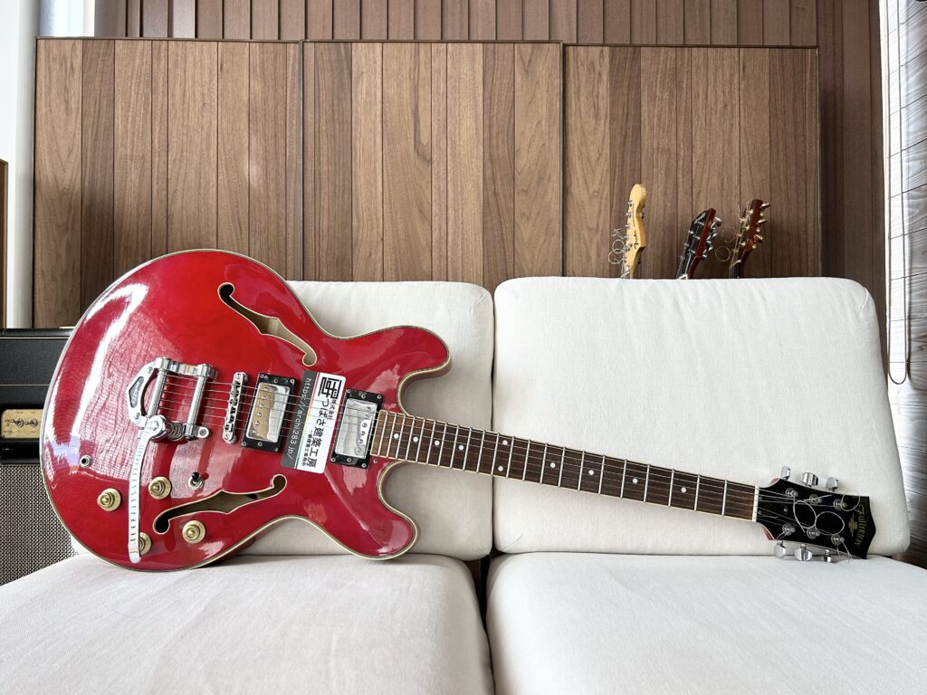 どうせいくらも弾かないからGibsonじゃなくて良い、安い物で良いからチェリーレッドの335無いかなぁと探していた時に某オクで見つけたのがこちら。