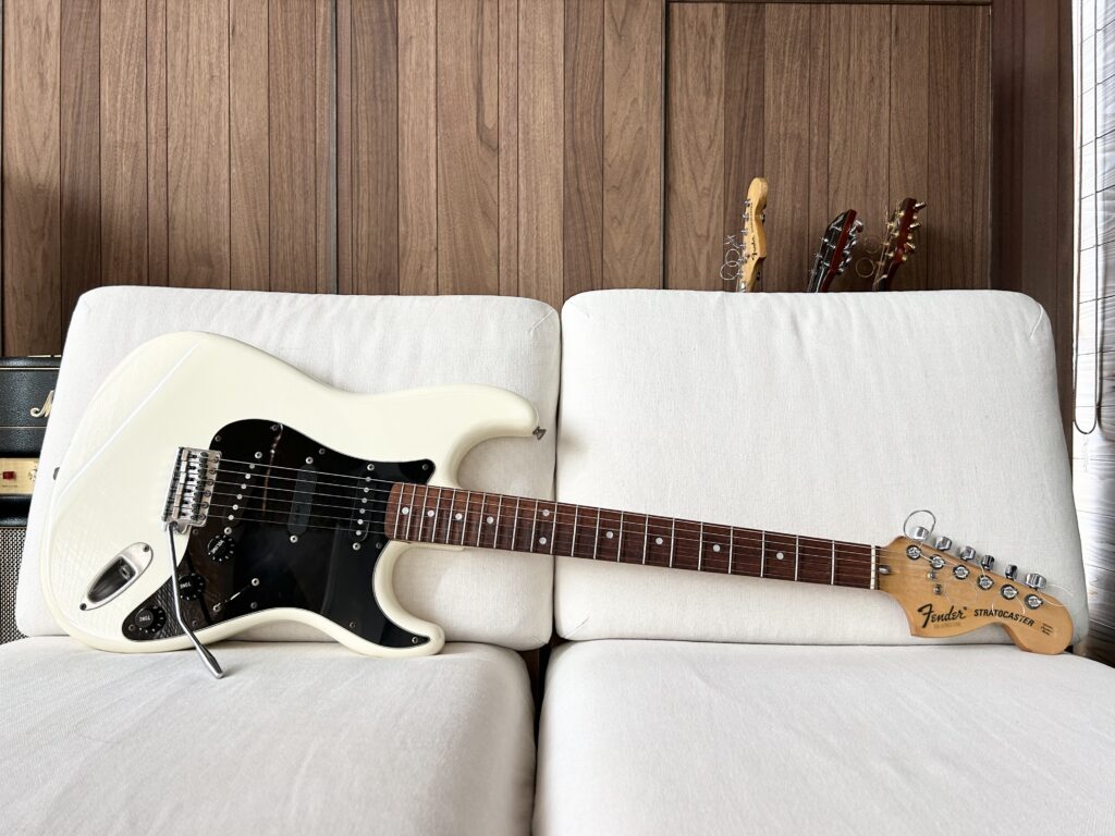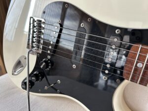 今ほどストラトが増える前に「自宅練習用に1本リッチーカラーが欲しいな」と思い某オクで入手したFender Japan Eシリアルの物。Eシリアルの物はJAPAN VINTAGEとか言って、昨今海外で人気?だそうですが私が落札したのは1桁万円の物。詳細は判りませんが多分ボディはバスウッド。所有するJVシリアルのST72-85と比べるとローズ指板の色も赤くて薄いし、改めてJVシリアル期の良さを感じます。